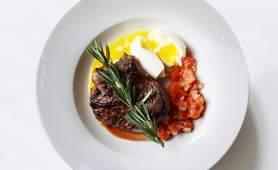 Entrecôte, chocolate sauce and sautéed vegetables